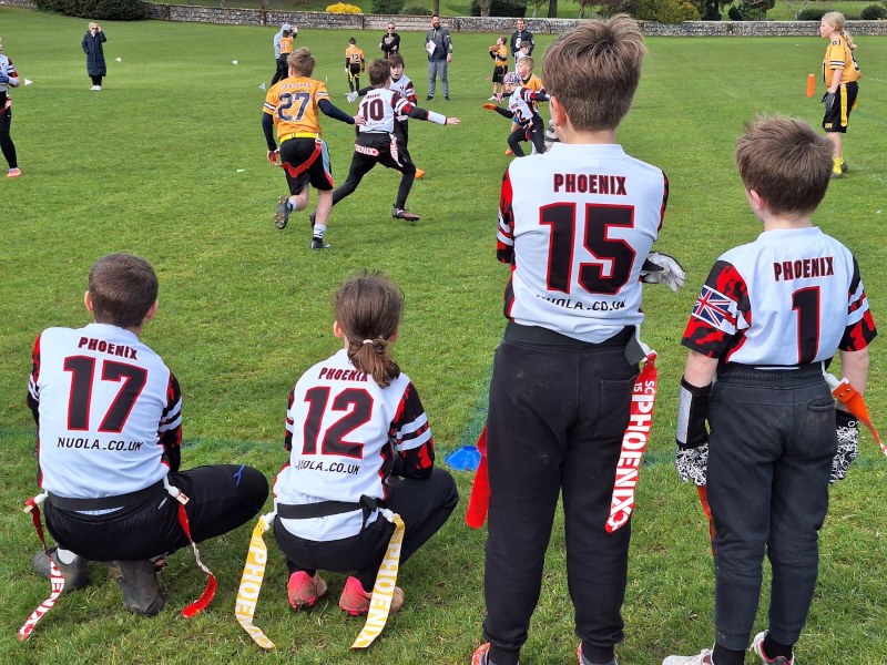 Over the course of the day, both teams faced competitive opposition, with the u11s going on to secure brilliant wins from their following two games. A 24-0 win over Scorpions Black was followed by a phenomenal battle against Solent Red Storm which finished 30-12 to the Phoenix. There were excellent link ups between QB Alba and fast footed RB Nikolas, WR Greyson and Centre Laurie, to get those all important points on the board.